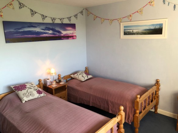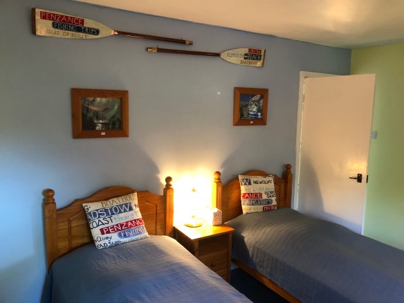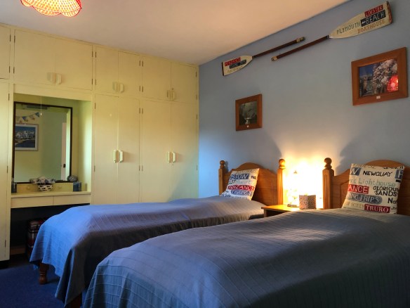 The floral bedroom is a good size twin room at the back of the cottage, with wonderful views out over the Aune Valley (see the picture at the top of the page). There are built-in wardrobes and shelves along with a dressing table with mirror.